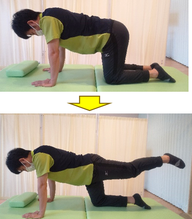主に背中や足の後面の筋肉を使った運動です。この運動では、動作時の姿勢の崩れの予防が期待できます。下の写真の足を上げる以外にも手を水平に上げる・対側の手足を同時に上げるなどの運動もあります。