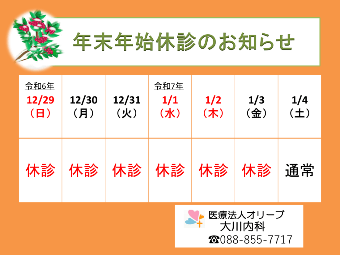 2025~2026年 年末年始休診日のお知らせ 投稿日 2025年10月14日 著者 大川内科 カテゴリー お知らせ カテゴリー その他 12月29日(日)~1月3日(金)まで休診となります。 2025年12/28(土)/2026年1月4日(土)は診察は午前のみ(受付は12時45分まで)となっております。 患者様にはご不便をおかけしますが、何卒ご了承ください。